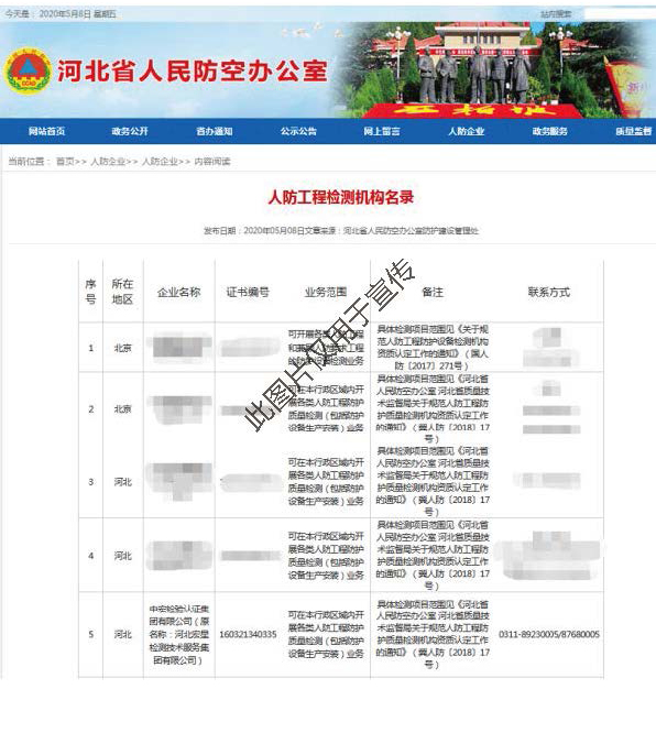 可在本行政區域內開展各類人防工程防護質量檢測(包括防護設備生產安裝)業務
