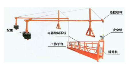 組成:高作作業吊籃一般由懸吊平臺、懸掛機構(含配重)、提升機、安全鎖、電氣控制箱、鋼絲繩等部件及配件組成