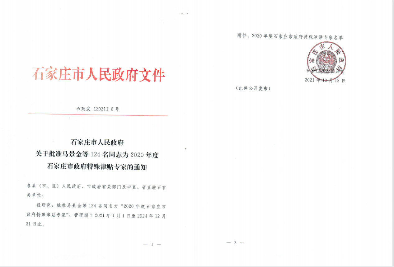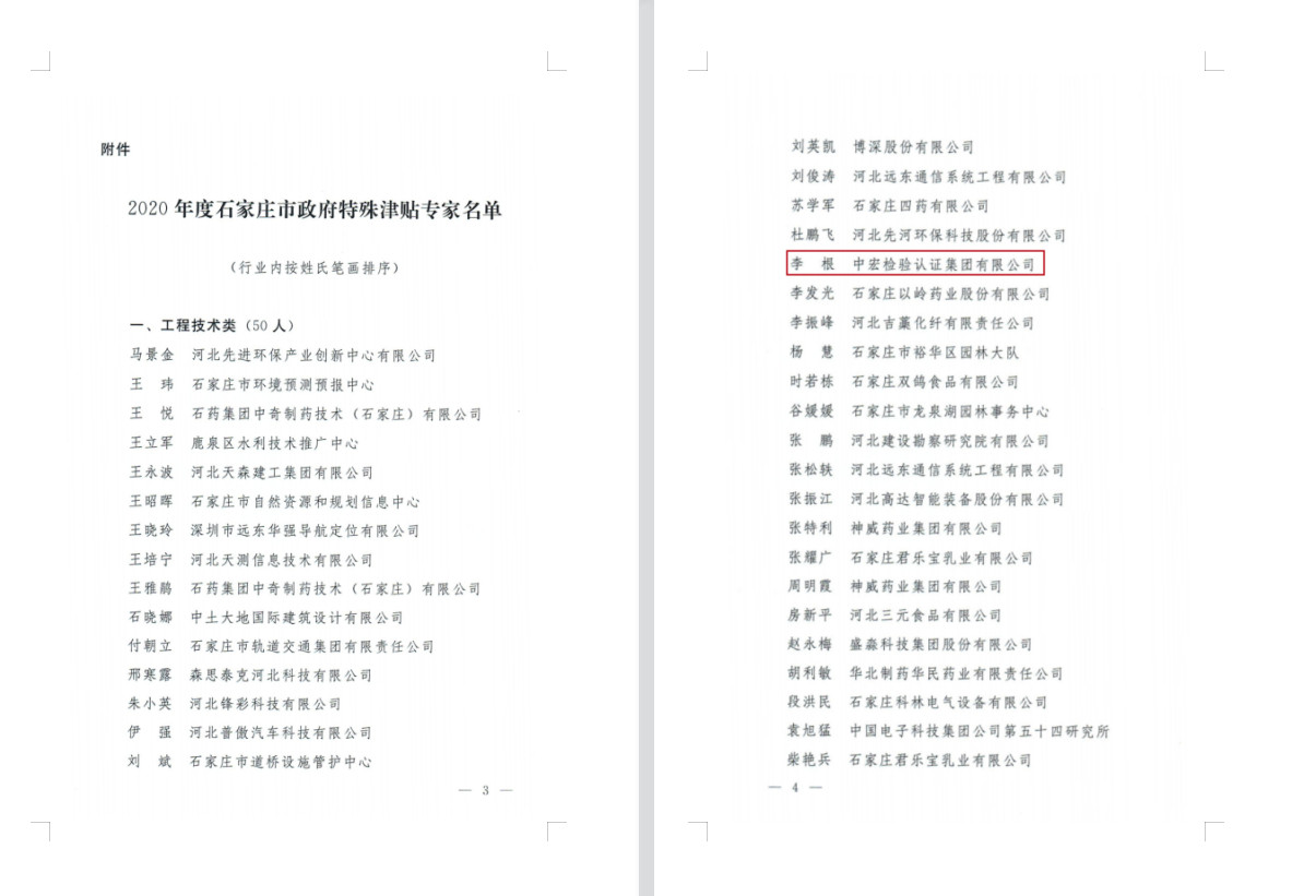 近日,中宏集團(CHIC)董事長李根同志被石家莊市人民政府批準為“2020年度石家莊市政府特殊津貼專家”,享受專家崗位工作津貼等待遇。