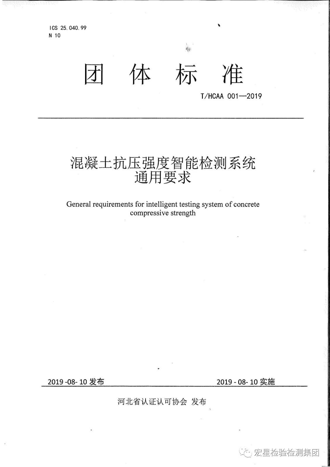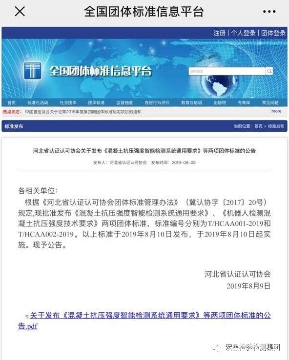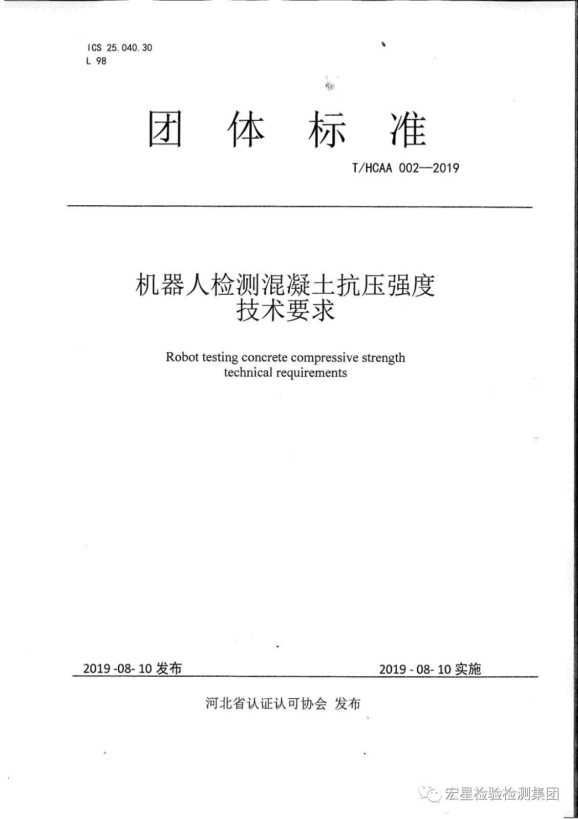 熱烈祝賀宏星檢驗檢測集團通過《混凝土抗壓強度智能檢測系統通用要求》、《機器人檢測混凝土抗壓強度技術要求》兩部團體標準